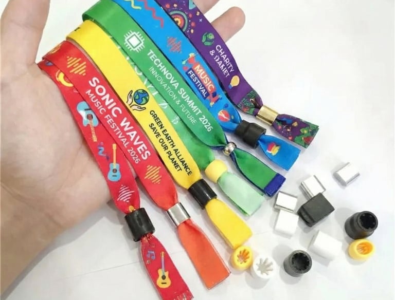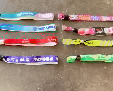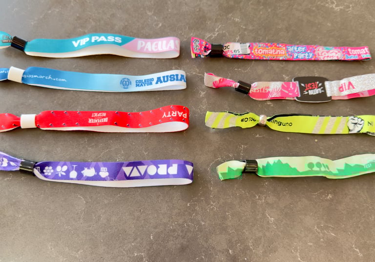 Pulseras bordadas o impresas con acabado profesional. Ideales para marca, control de acceso y recuerdo del evento